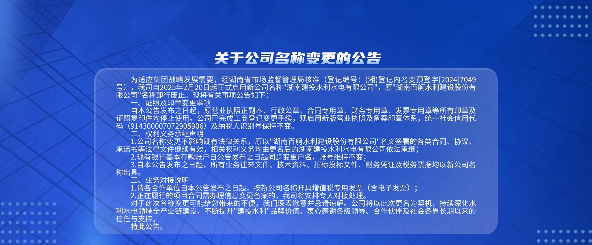 2022年9月,原湖南建工集團(tuán)與原湖南交水建集團(tuán)合并組建湖南建設(shè)投資集團(tuán)。原雙方集團(tuán)旗下的湖南百舸水利建設(shè)股份有限公司和湖南建工集團(tuán)水利水電工程公司合并為湖南建投百舸水利公司,實(shí)行兩塊牌子(百舸水利、建工水利)管理,為湖南建投集團(tuán)唯一水利建設(shè)企業(yè)。2024年9月,公司正式更名為湖南建投水利水電有限公司(簡稱湖南建投水利),統(tǒng)籌管理“百舸水利”“建工水利”“施工公司”“疏浚公司”等子品牌。